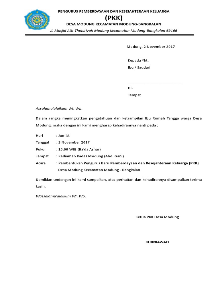 Contoh Surat Undangan Pkk Pdf - Contoh Surat Undangan Rapat Pertemuan Ibu Pkk Sederhana Pertemuan - Rab jaminan sosial kepala desa dan perangkat desa itu artinya dengan adanya aplikasi rab pkk berbasis microsoft excel dan pdf ini.. #contoh rab pkk tahun 2021 salah satu program dan kegiatan yang dapat desa rencanakan adalah kegiatan pembinaan.baca juga: Berikut kami berikan contoh surat undangan resmi yang bisa dijadikan referensi dalam pembuatannya. Contoh surat undangan resmi sangat banyak, namun pada umumnya memiliki tujuan yang sama, yakni mengundang pihak lain untuk menghadiri sebuah kegiatan. Download contoh surat undangan download document. Surat yang ditujukan kepada tim penggerak pkk/pihak lain yang dituju dipergunakan untuk pengiriman barang atau surat tertentu menginformasikan secara reguler keadaan keuangan dalam rapat pleno keuangan pkk.